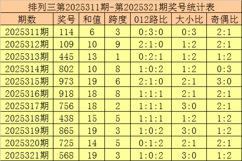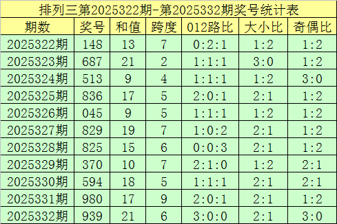 开奖追思:陈列三第2025332期奖号开出:939,组选类型:组三,大小比为2:1,奇偶比为3:0,和值为21,跨度为6。
